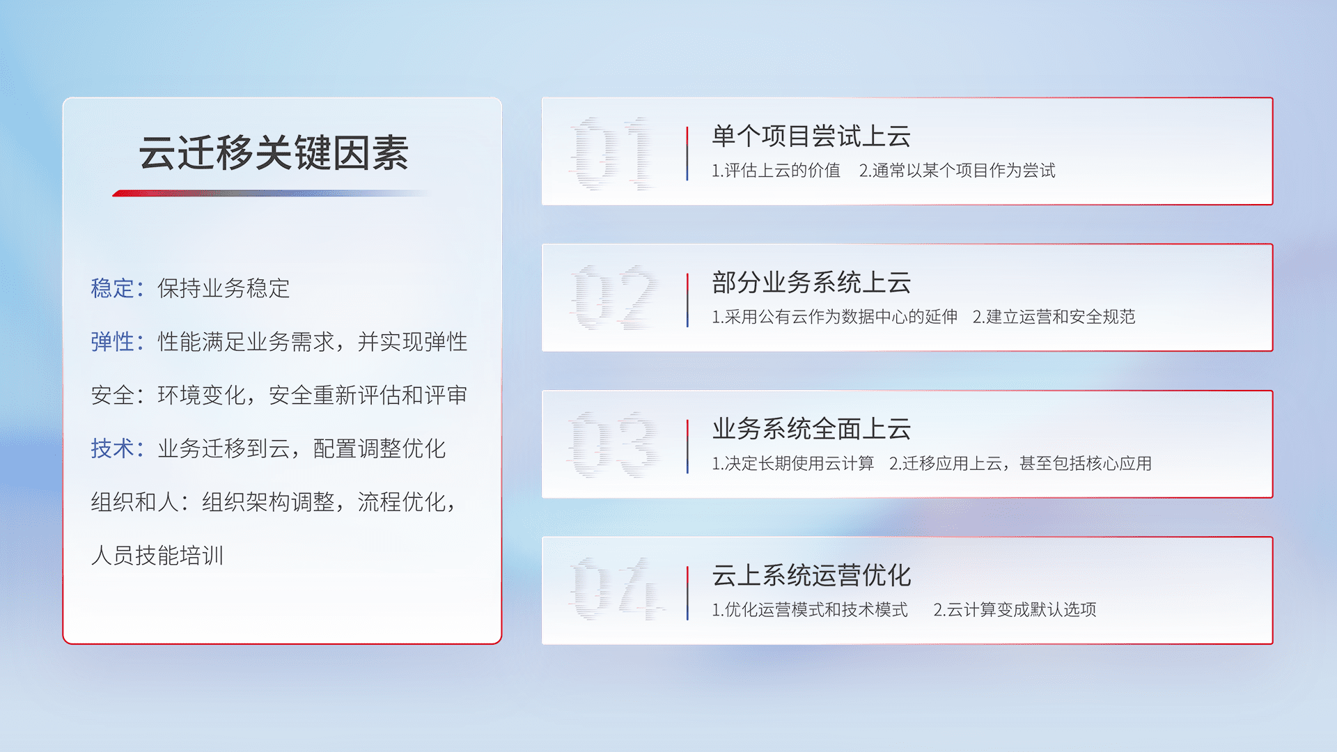 结合实际业务,,,,从规划设计、、、、云平台选型、、云原生改造、、、、数据迁移、、集成交付,,迁移全过程为客户识别最佳上云路径,,,,做好风险识别管理,,,,设计网络架构、、、身份权限、、安全审计合规、、、操作审计、、、日志审计、、、监控告警策略、、多站点容灾设计等,,对云上基础设施进行整体规划,,,提升IT治理水平,,以满足弹性、、、、高可用、、高性能的需求。。。。