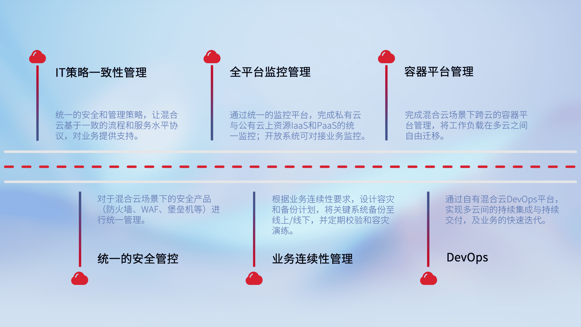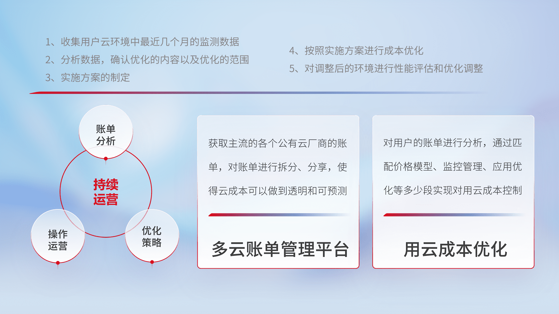通过多云纳管,,,以统一的资源数据模型把客户的云资源进行抽象和封装,,,,进而实现对多云资源的统一操作,,,,保障云资源管理的可靠性、、、、稳定性与可用性。。。。量身定制化运维内容,,,,配置、、开发运维、、补丁管理、、、、备份、、、监控、、、、认证和访问管理、、、审计和日常巡检等,,,保障在用云过程中的可靠度,,稳定度以及高可用率。。。