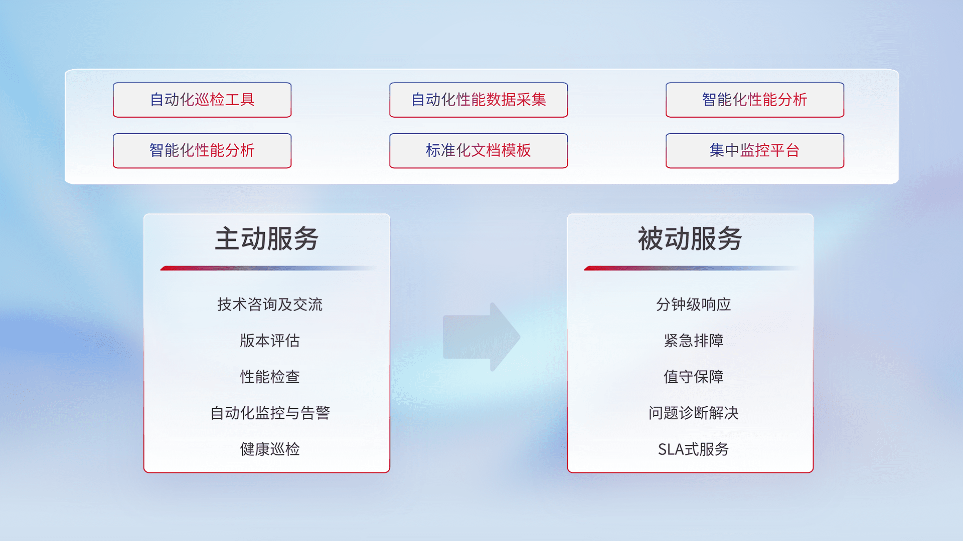 智能化工具和标准化文档,,保障服务质量,,提供主动服务(包含技术咨询、、、版本评估、、、性能检查、、、自动化监控与告警、、、健康巡检)和被动服务包含(分钟级响应、、紧急排障、、、值守保障、、问题诊断解决、、、、SLA服务)。。。。
