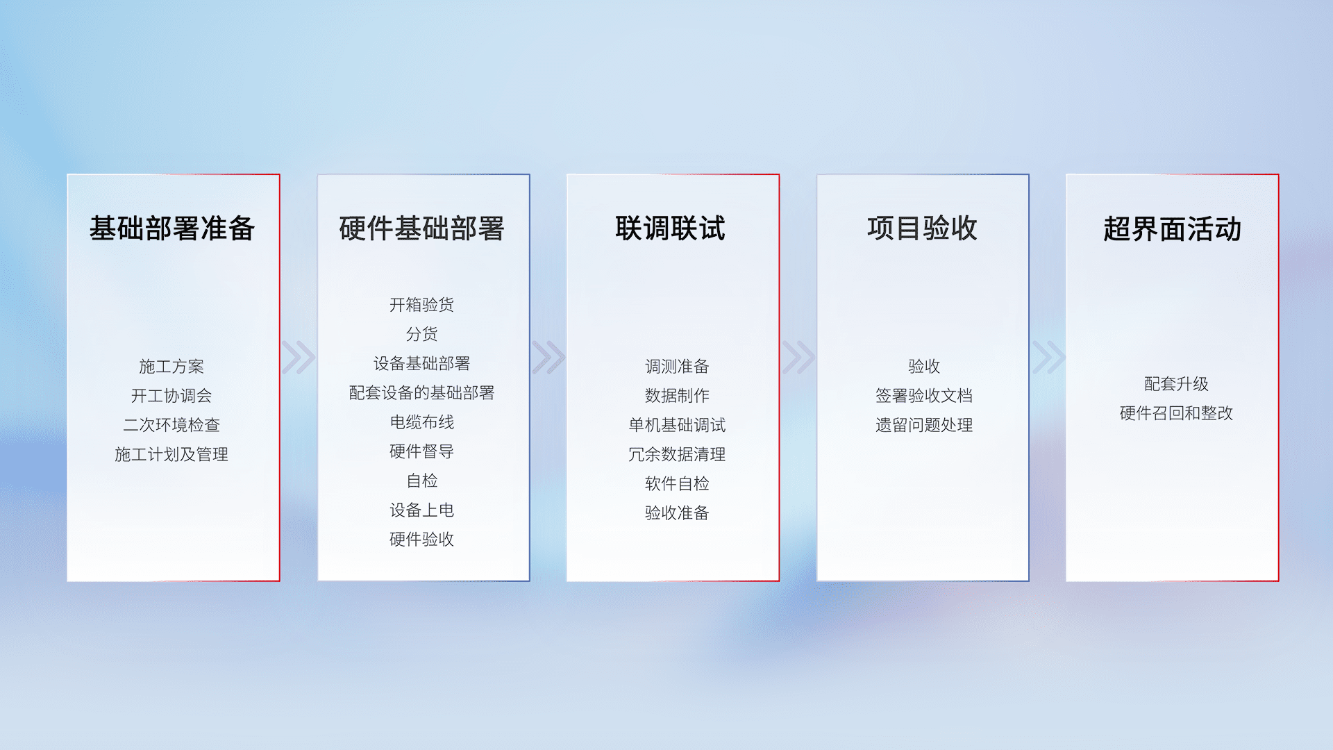 从基础部署准备、、、、硬件基础部署、、、联调联试、、、项目验收、、、越界面活动的全过程可追溯,,,保证施工质量和进度。。